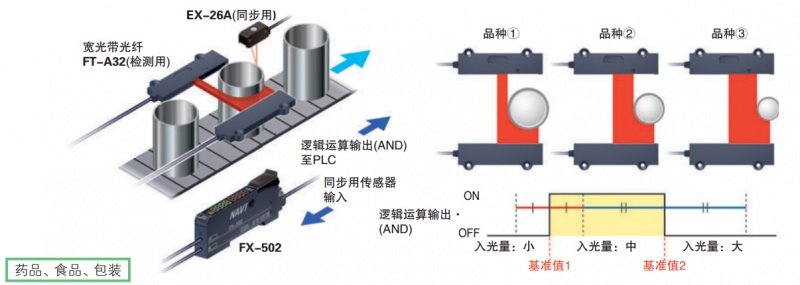 通過使用寬光帶光纖,可根據容器尺寸的不同獲得入光量的差,從而實現穩定檢測。另外,利用FX-502的 外部輸入及邏輯運算輸出,并通過比較進行判別,從而實現了利用比以往更少的傳感器臺數及I/O點數來進 行品種判別,有助于降低綜合成本。