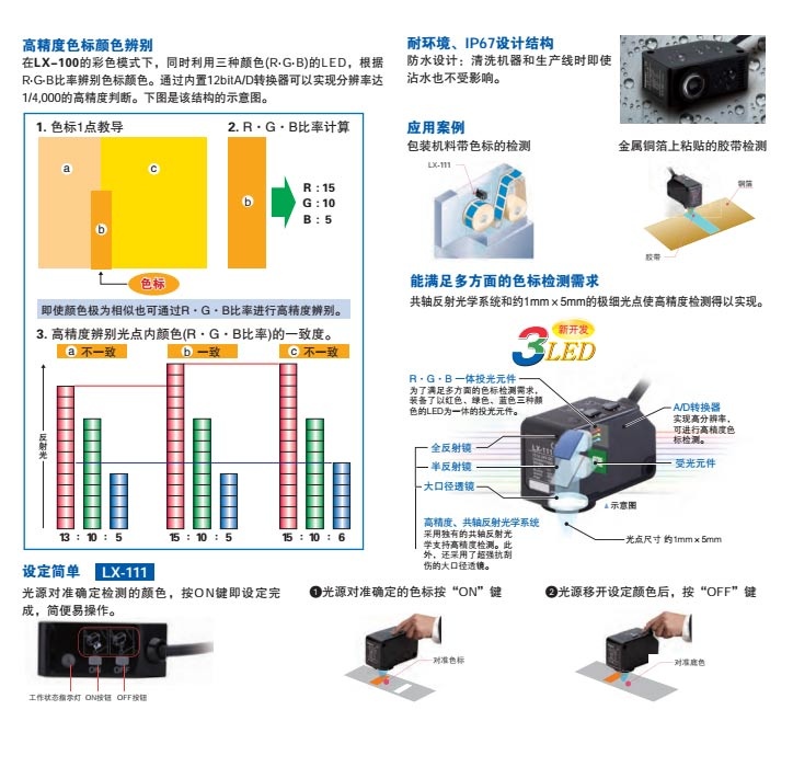 | 靈敏度設定方法 | 色標模式時:2點教導/全自動教導,彩色模式時:1點教導 | ||