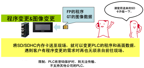 SD/SDHC內(nèi)存卡中存儲(chǔ)的PLC中的程序(GR,Pro皆可)和GT的畫面上的數(shù)據(jù)可安裝在其它的FP系列PLC和GT系列產(chǎn)品中。