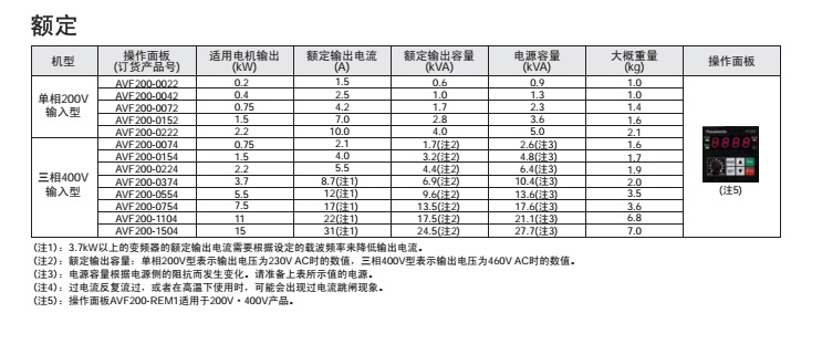 | 機(jī)型 | 操作面板 | 適用電機(jī)輸出(kW) | 額定輸出電流(A) | 額定輸出容量(kVA) | 電源容量(kVA) | 大概重量(kg) | 操作面板 |