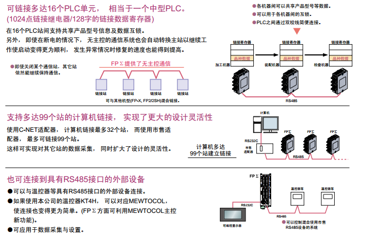 如果使用通信插件(RS485型),可在最多16臺FPΣ之間方便地共享位數據/字數據。(與FP-X、FP0R、FP-X0、FP2可混合使用)