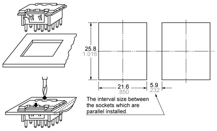 The thickness of applicable chassis plates ranges from 1.0 to 2.0 mm .039 to .079 inch. To install the socket easily, insert the socket top surface into the drilled holes and press the two points on the fastening plate indicated by arrows as shown in the fig. below. ![]() Dimensional tolerance of machining: ±0.1 ±.004 |