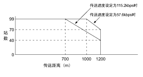 ※3 傳送距離、通信速度、站數的值請確保保持在下表所示的圖表范圍內。