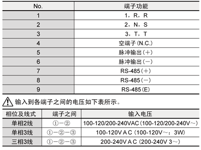 - 2.電壓輸入端子(No.1、2、3)的配線請使用截面積為0.14~1.5mm2(AWG#26~14)的電線(剝離線長度為7mm),脈沖輸出端子(No.5、6)的配線請使用截面積為0.14~1.0mm2(AWG#26~16)的電線,通信端子(No.7、8、9)的配線請使用截面積為0.3~1.0mm2(AWG#22~16)的電線(剝離線長度為5mm)。在通信端子上連接2線的情況下,請使用截面積為0.3~0.34mm2,且尺寸相同的兩根電線(剝離線長度為5mm)。
