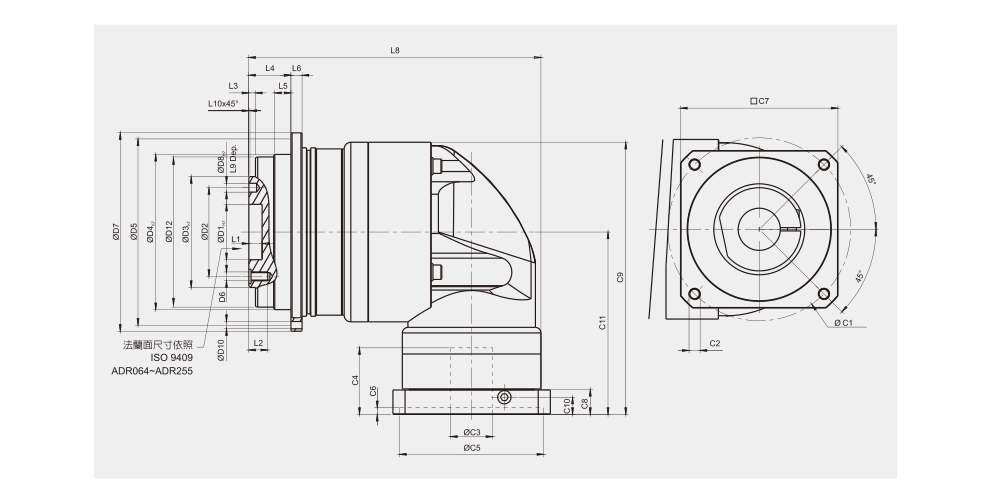 ADR 系統 用蝸線傘齒輪設計,容許伺服馬達高轉速的輸入,得到最高扭距的輸出,嚙合蝸線經最佳化的運動誤差分析,自設的精密研磨設備,製造出最低的運轉背隙,效率高、壽命長、免保養,為業界最高級的直角法蘭面產品。