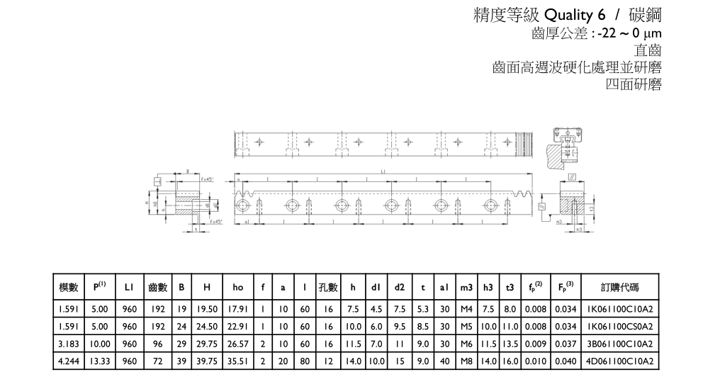 APEX臺灣精銳直齒齒排(配合線性滑軌180°界面) 精度等級 Quality 6 / 碳鋼 (模數(shù)M:1.591、3.183、4.244 )
