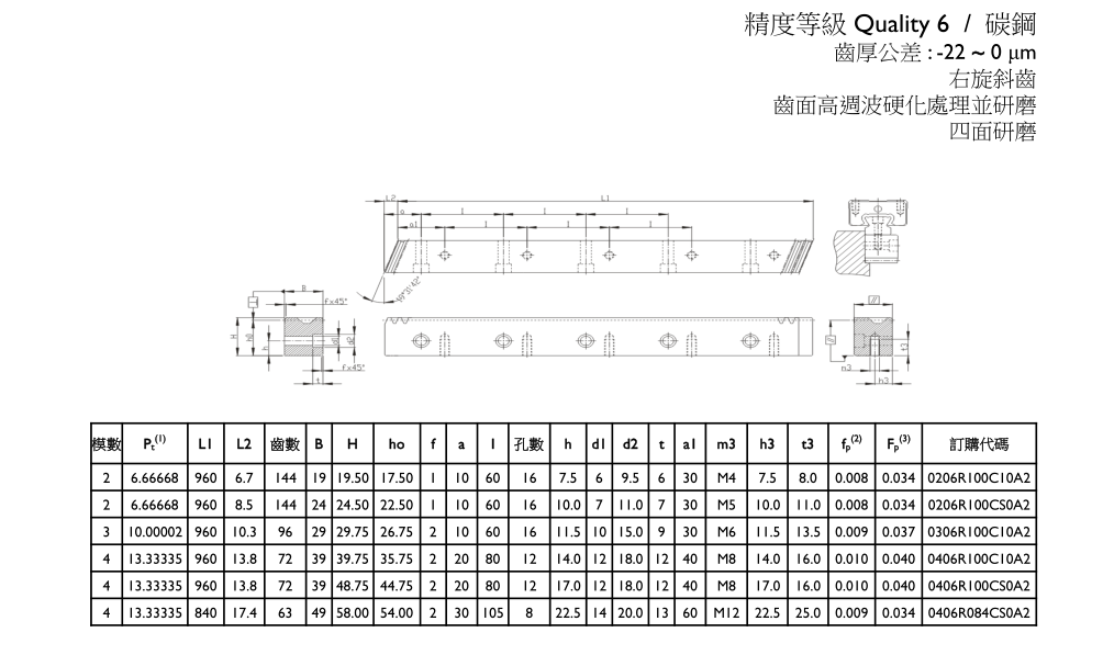 APEX臺灣精銳斜齒齒排(配合線性滑軌180°介面) 精度等級 Quality 6 / 碳鋼 (模數(shù)M:2、3、4 )