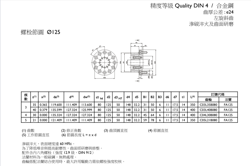 APEX臺灣精銳斜齒齒輪(直鎖式 / EN ISO 9409-I-A) 精度等級 Quality DIN 4 / 合金鋼 螺栓節圓Φ125 (模數M:3、4、5)