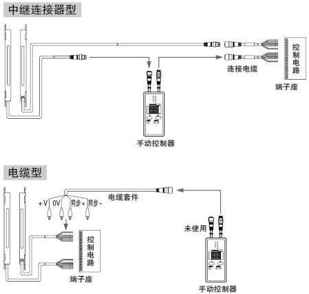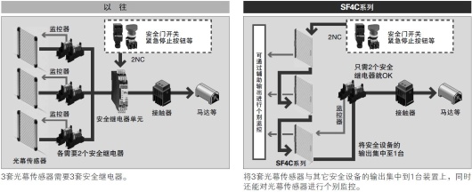 光幕傳感器本體上可以連接緊急停止開關(guān)、安全門開關(guān)等的輸出接點。此外,使用手動控制器SFC-HC,可以對3套光幕傳感器進行跨接配線,同時對安全輸出進行集中控制。 |