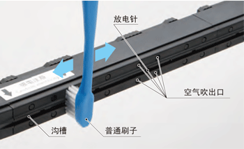 由于前端采用扁平形狀,因此只需沿著溝槽刷掃,即可一并完成放電針和空氣吹出口的清潔操作。 |