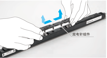 將放電針實現組件化(4根針一套),從而大幅簡化更換操作。根據組件上的箭頭向兩側滑動,即可簡單地完成拆卸操作。 |